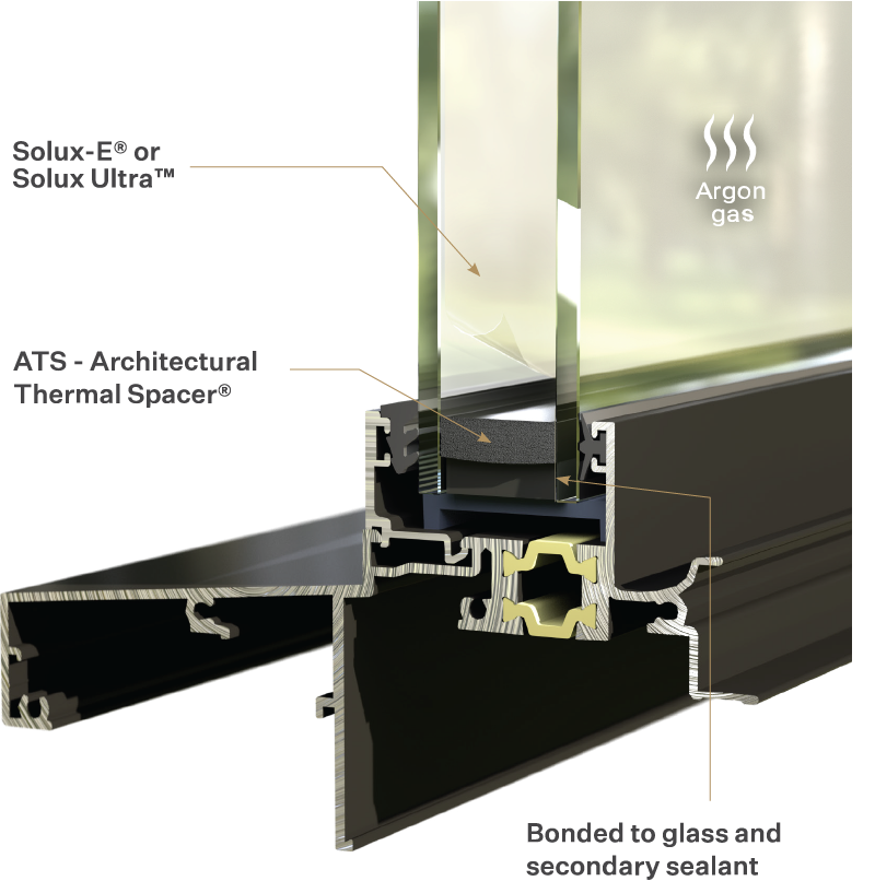 The ATS-Architectural Thermal Spacer® reduces the transfer of hot and cold temperatures. Argon gas creates an additional barrier to heat loss and improves insulation. Solux-E® is a low emissivity (Low-E) coating that reduces heat loss in winter and over-heating in summer. It protects your home's interior while providing a similar clarity to clear glass.